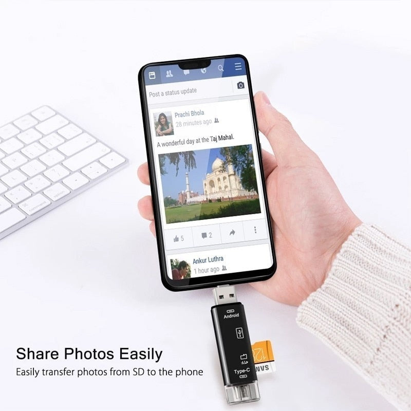 Ce lecteur est doté d'une conception USB intégrée Type-C, de ports micro USB, d'une fente pour carte USB et TF. Il vous facilite le téléchargement ou la lecture de vos données ou que vous soyez. Il vous permet aussi de transférer des images de films ou de fichiers HD en quelques secondes.