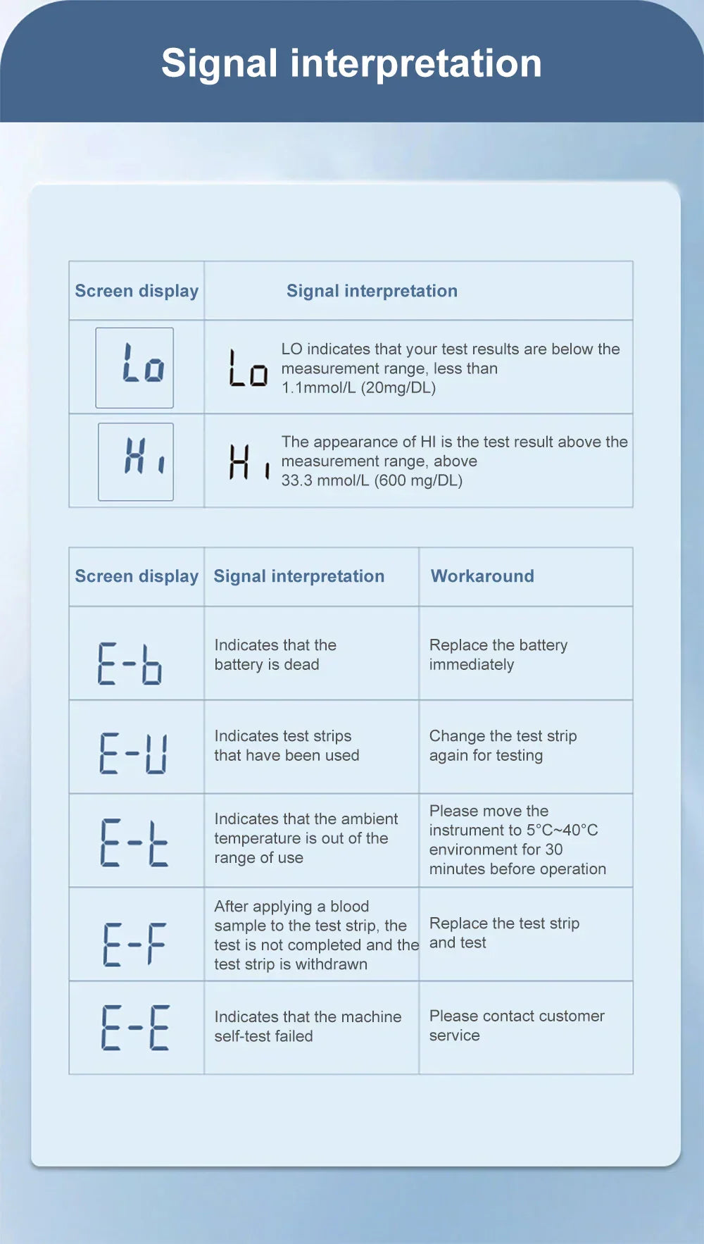 SystÚme intelligent LO/HI : alerte en cas de taux anormalement bas (moins de 20 mg/dL : LO) ou élevé (plus de 600 mg/dL : HI).